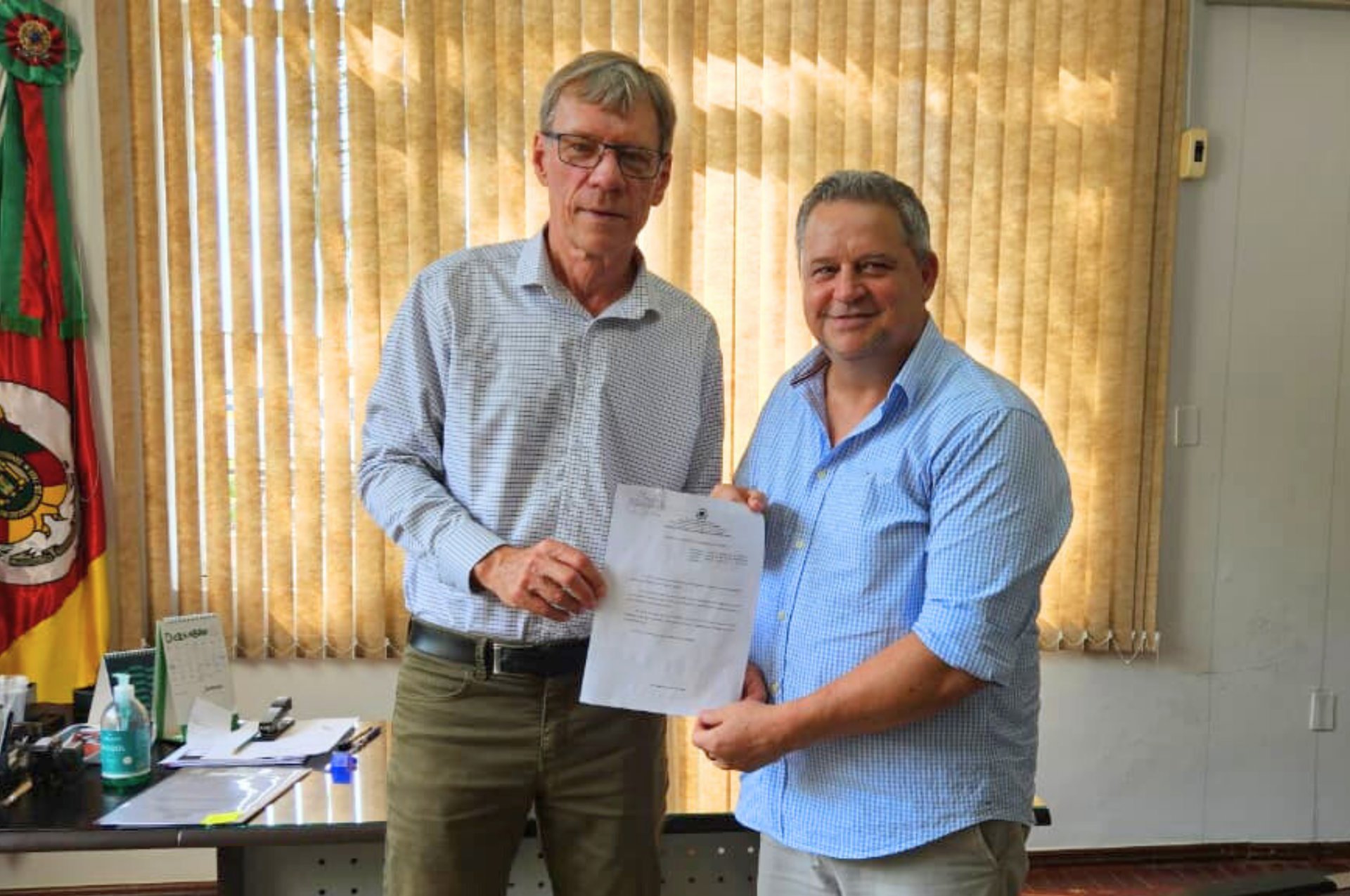 O prefeito Piti Werle sancionou, na manhã de segunda-feira, 1º, a lei que denomina como “Rodovia Celestino Stragliotto” a estrada vicinal que liga a localidade do Rincão de São Pedro à BR-285. A assinatura do ato contou com a presença do vereador Mário Trindade, autor da proposta.