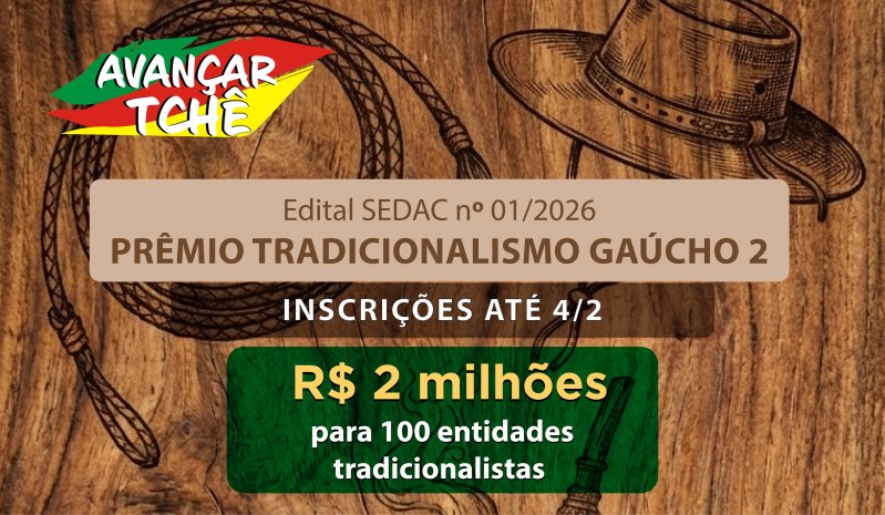 A Secretaria da Cultura do Estado do Rio Grande do Sul (Sedac) lançou a segunda edição do Prêmio Tradicionalismo Gaúcho, iniciativa do programa Avançar Tchê que vai destinar R$ 2 milhões a entidades tradicionalistas gaúchas. O edital 01/2026 foi publicado no Diário Oficial do Estado na quarta-feira, 14 de janeiro, e as inscrições seguem abertas até as 16h59min do dia 4 de fevereiro.
